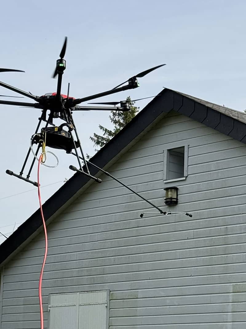 Nous réalisons le nettoyage de toitures, façades, panneaux solaires et surfaces en hauteur à l’aide de drones captifs, de perches et d’une cloche de nettoyage.
