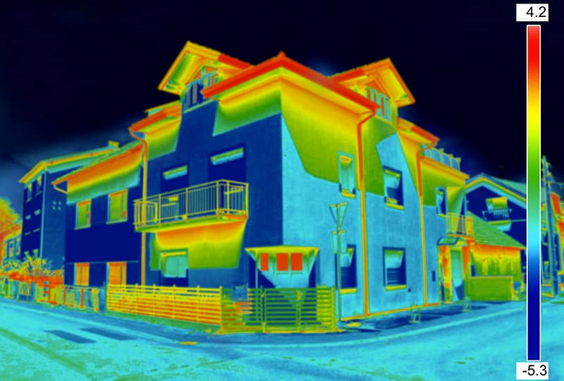 Inspection infrarouge par drone pour détecter pertes thermiques, infiltrations et ponts thermiques.